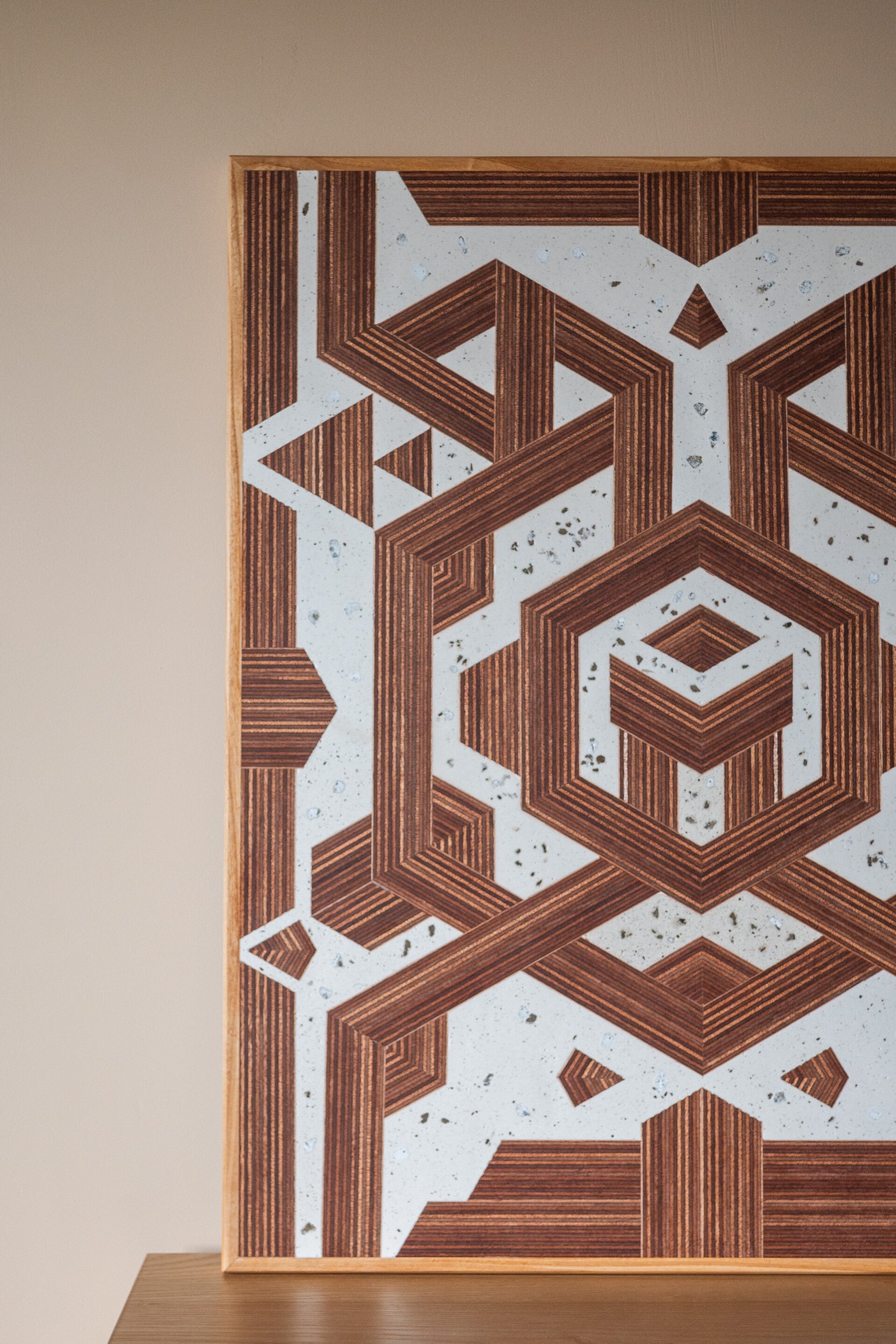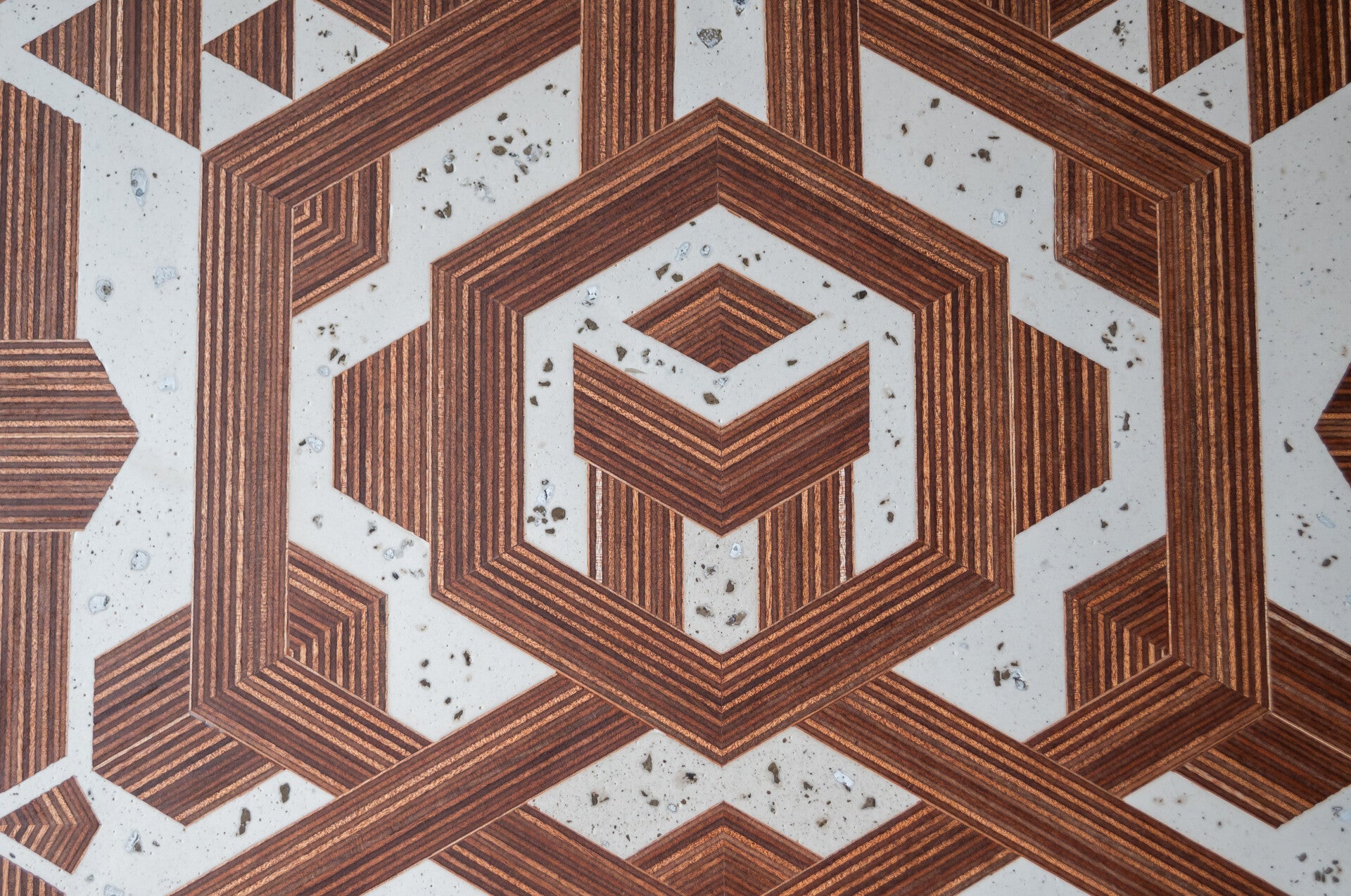 De patronen zijn gemaakt van Okoume multiplex. De restruimte is opgevuld met een kunsthars. De donkere puntjes hierin zijn stukjes steen van de Utrechtse DOM toren.